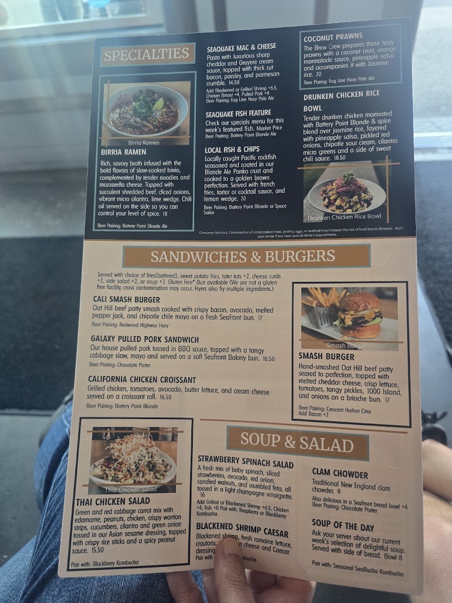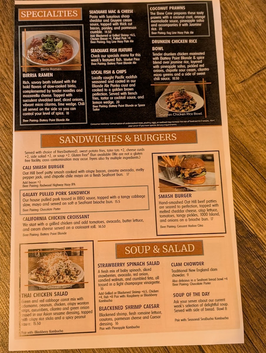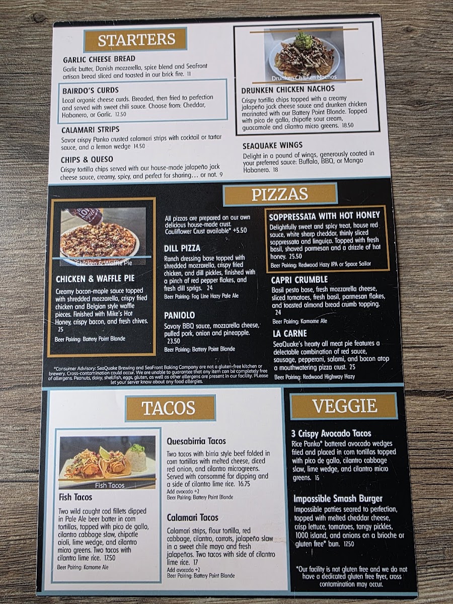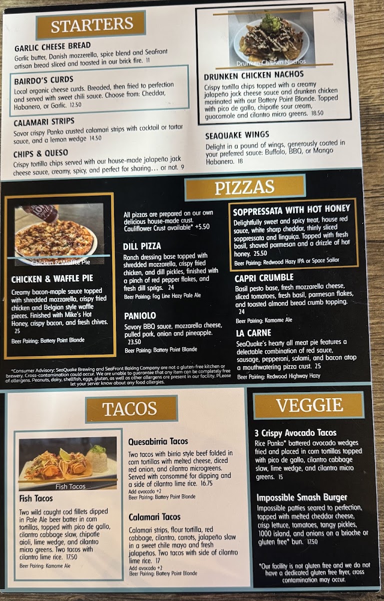A SeaQuake twist on the classic macaroni and cheese. A hearty helping of pasta is blended in a luxurious sharp cheddar and Gruyere cream sauce and tossed with thick cut bacon. Topped with a parmesan crumble. Gluten, Dairy and Pork Allergy