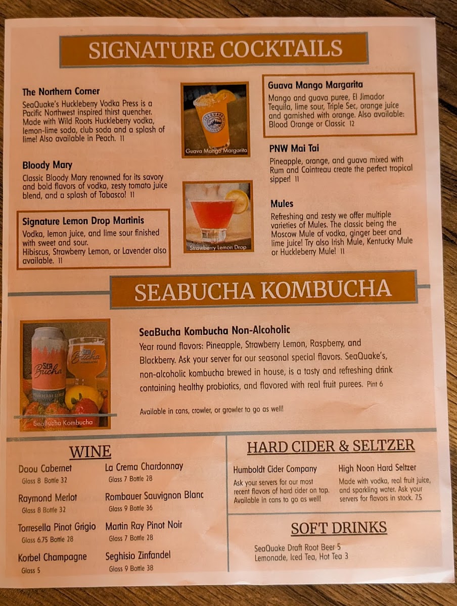 SeaQuake's own Kombucha, brewed here in house. Kombucha starts as a sweet tea that is then fermented with good bacterias and yeasts which take away the “tea” flavor and replace it with a tasty refreshing drink that contains healthy probiotics. Some then flavored with real fruit purées.